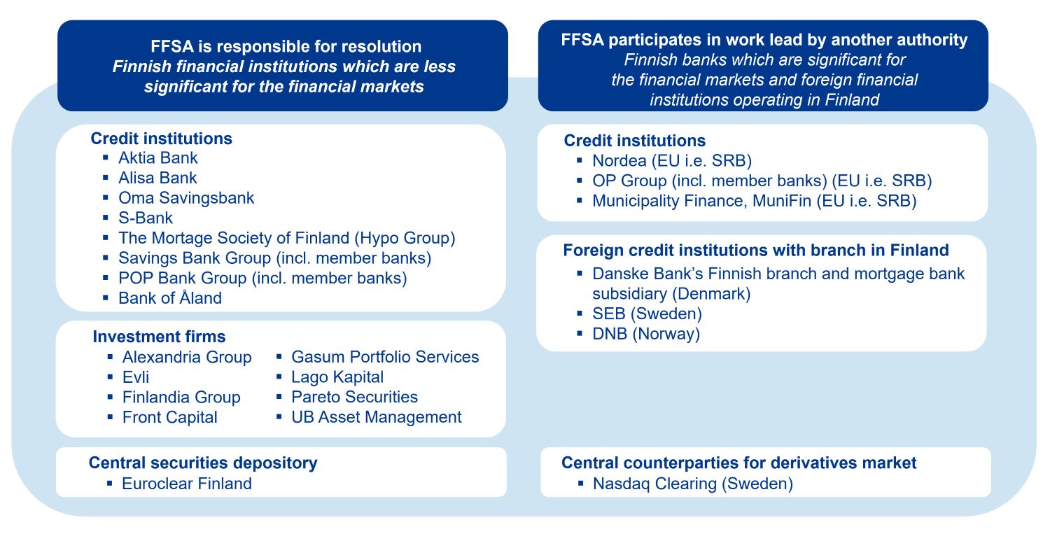 To help prepare for a crisis, the Financial Stability Authority (FFSA) draws up resolution plans for Finnish banks, other credit institutions, investment firms and the central securities depository. As a rule, these plans are drawn up for the institutions at the group level. A resolution plan provides for a situation where a bank or other institution referred to in the Act on the Resolution of Credit Institutions and Investment Firms is about or likely to default for financial reasons.
